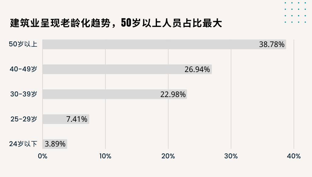 根据今年4月28日公布的《2022年农民工监测调查报告》,2022年从事建筑业的农民工减少了325万人,是近五年来减少数量最多的一年,同比减少1.3%。同时,建筑业劳动力出现老龄化,根据2021年《中国人口和就业统计年鉴》,建筑从业者中中老年人群(年龄45岁及以上)的比例不断提升。