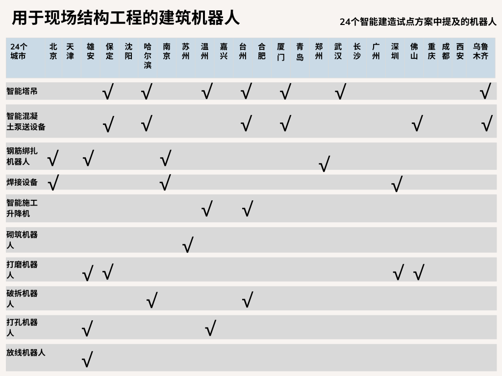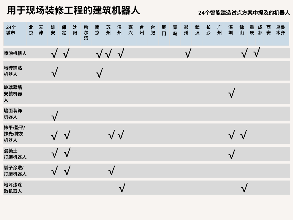由上表可见,雄安新区是提及这一应用场景下建筑机器人最多的城市。《雄安新区智能建造试点城市实施方案》鼓励积极试用面装饰等多场景的建筑机器人代人施工与辅助施工。