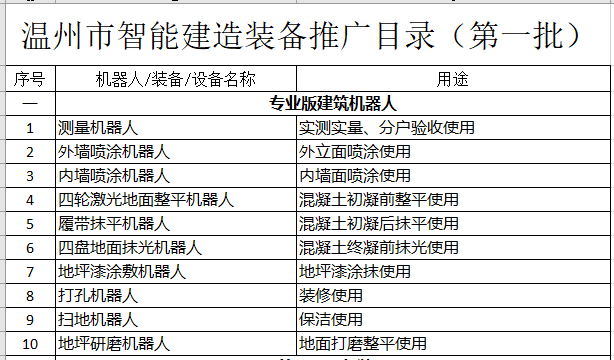 而24个试点城市之一的温州,则将十款专业版建筑机器人列入智能建造装备推广目录中,包括外墙/内墙喷涂机器人、地面整平机器人等,如下图。
