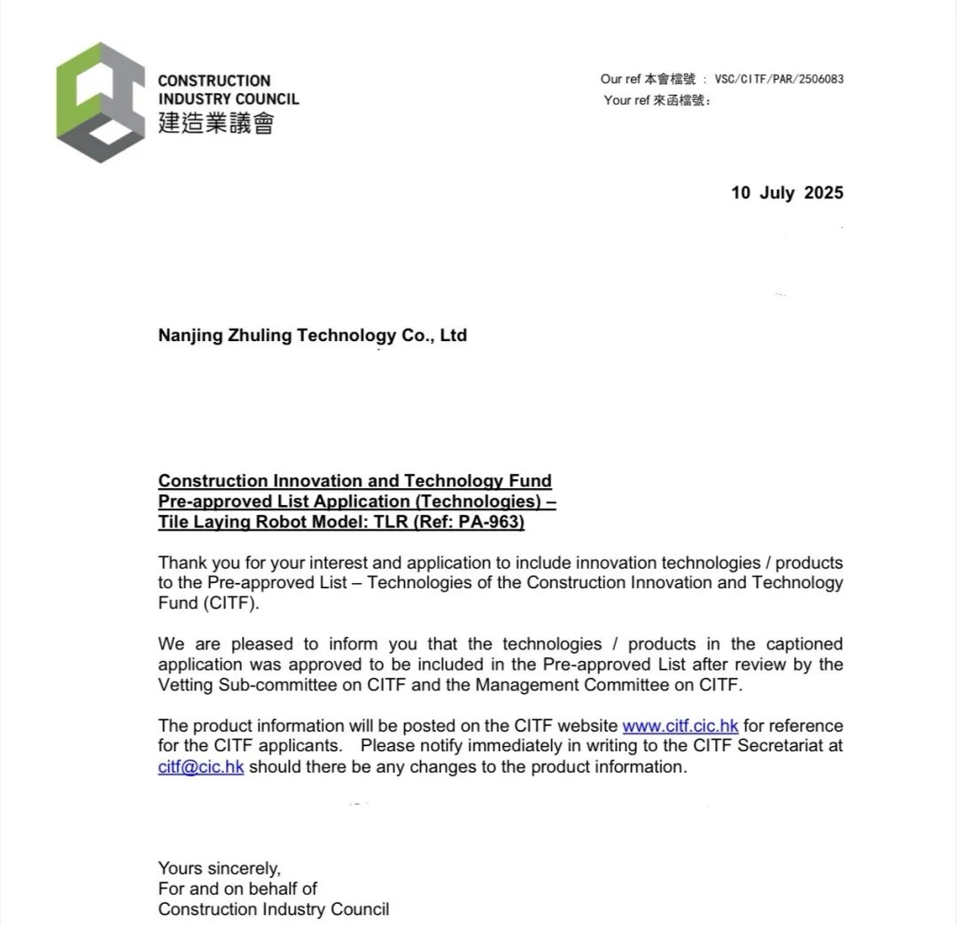 自香港CITF基金成立以来,始终以推动建筑业创新为核心。此次将筑领科技的两款机器人纳入清单,正是因为筑领科技与其 "提升施工效率、保障工程质量、降低安全风险" 理念的深度契合。