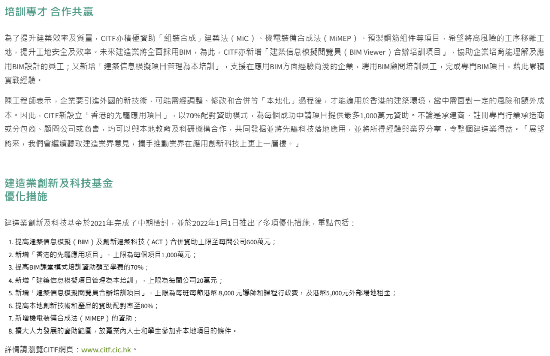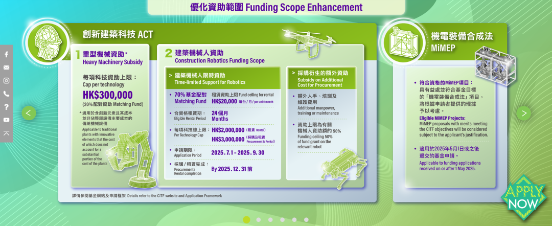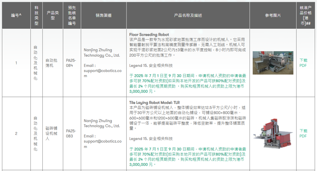筑领科技高精找平和地砖铺贴机器人,最高300万港元限时资助发表时间:2025-12-05 17:56 ![]() CITF 建造业创科基金 CITF 建造业创科基金即建造业创新及科技基金,是由香港特别行政区政府设立的,旨在推动建造业创新发展的基金。 基金特别注重支持中小型企业,超过 60% 的受资助机构为中小型承建商、分包商及顾问公司。这一举措缩小了行业内技术应用的鸿沟,推动全产业链协同升级。 ![]() (CITF官网页面) 资助范围及金额 2022 年起,BIM 及创新建筑科技(ACT)合并资助上限提升至每间公司 600 万港元;2023 年 4 月 1 日起,每位基金申请者于建筑讯息模拟及创新建筑科技方面的总资助上限,由 600 万港元大幅提升至 750 万港元。优先选择预批准产品清单内的设备,可减少技术审核时间。 截至 2021 年底,该基金已经批出超过 2200 份申请,资助逾 5.7 亿港元,成功支援超过 830 间本地建造业机构应用创新科技。 同时针对中小型企业(SMEs)推出简化申请通道,提供免费咨询服务及模板化申报文件,2023 年超 60% 获批项目来自 SMEs。 ![]() (图片来源:建造业议会) 筑领科技机器人 已成功纳入CITF资助名单 ![]() (图片来源:CITF官网) 地砖铺贴机器人: 采用激光融合视觉导航、全向移动底盘、地砖全局标高水平定位系统、地砖边缝视觉测量定位系统、四点分布式振捣系统、粘结剂精准铺设系统等多种技术,可解决地面不平带来的地砖平整度问题,降低地砖空鼓率,提升铺贴质量。其作业轨迹精度控制在 0.5 毫米以内,确保铺贴效果远超人工水平。 高精地面找平机器人: 专门用于地面干混砂浆的整平施工,无需打点冲筋,实现正负 2 毫米以内的地面平整度控制。施工效率能达到每天 150 平方米,且运输方便、操作简单,可高精度、高效率地完成地面整平工作。施工完成面的强度、密实度均达到质量要求,避免了基层空鼓的风险,能为后续地砖铺贴机器人的施工做好充分准备。 申请流程 官网链接: https://www.citf.cic.hk/ 所需文件:https://www.cic.hk/cic_data/files/CITFDoc/CITF-Portal-User-Guide_Chi_20190911.pdf 截止日期:9月30日 ![]() (图片来源:CITF官网) 有购买意向或想咨询补贴事宜者,可以私信筑领科技公众号后台或者扫描以下二维码和我们取得联系,我们可以协助办理补贴申请。 ![]() https://f.kdocs.cn/g/rcYLj3w6/ ![]() |